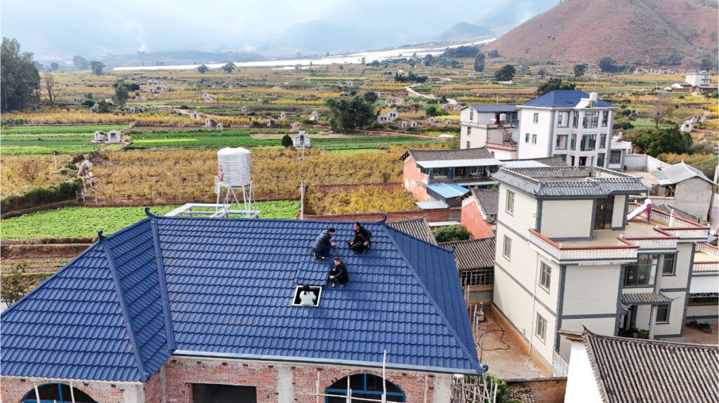 Located in a scenic rural town in Lijiang, Yunnan Province, this new residential construction project was initiated in November 2025. The homeowner’s decision was driven by the proven success of a neighbor’s installation using our products. Witnessing the durability and aesthetic transformation next door, the client adopted the same high-standard roofing solution. The project encompasses three residential units with a total area of 760 square meters, replacing aging traditional materials with our vibrant Blue Stone Coated Metal Roof Tiles.